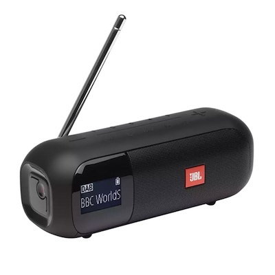 In the kitchen. By the pool. At the park. Now you can take your favorite DAB/DAB+/FM radio stations wherever the day takes you. The sleek JBL Tuner 2 is a compact portable radio with crystal clear sound Bluetooth and 12 hours of playtime. Quickly tune to your favorite stations with 5 preset buttons and easy-to-read station information on the scrolling LCD display. It's rated IPX7 waterproof and ready for the outdoors so even in a sudden rainstorm there's no need to stress. Listen for hours. From news and weather in the morning to music and entertainment at night.