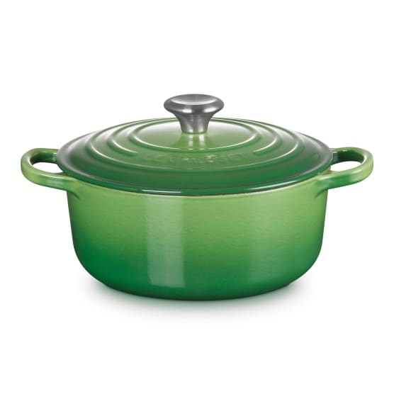 Le Creuset is known the world over for making the best in cast iron cookware with its beautiful bright colours and long-lasting quality. The Signature range has the classic durable and hygienic enamel finish but also includes wider handles that provide even weight distribution and a secure grip and larger more comfortable knobs that are heat resistant up to 260°C. 2.4 litre round cast iron casserole in Bamboo.