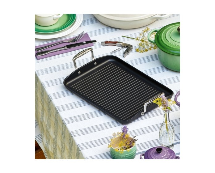 This rectangular grill pan is ideal for searing meat fish or vegetables quickly with little or no fat or oil for healthy and delicious cooking. The ribbed base allows any juices and oils to drain away from the food whilst giving professional-looking sear lines to your steaks skewers and brochettes.