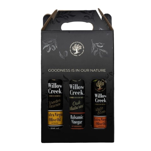A must for every kitchen this Gift Set includes Willow Creek's award-winning Directors Reserve Extra Virgin Olive Oil Estate Blend Extra Virgin Olive Oil — which comes in a squeeze-me bottle which you'll love for its perfect portion control and added convenience and a tasty Cabernet Sauvignon Balsamic Vinegar. This tasty trio is made for creating delicious dishes!