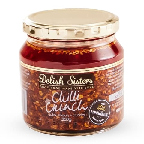 The carefully balanced combination of onion chilli ginger garlic sesame seeds and oil of The Delish Sister's Chilli Crunch is guaranteed to add flavour crunch and a mouth watering burst of heat to almost any dish. Instantly elevate eggs proteins dips noodles salads sandwiches and more!