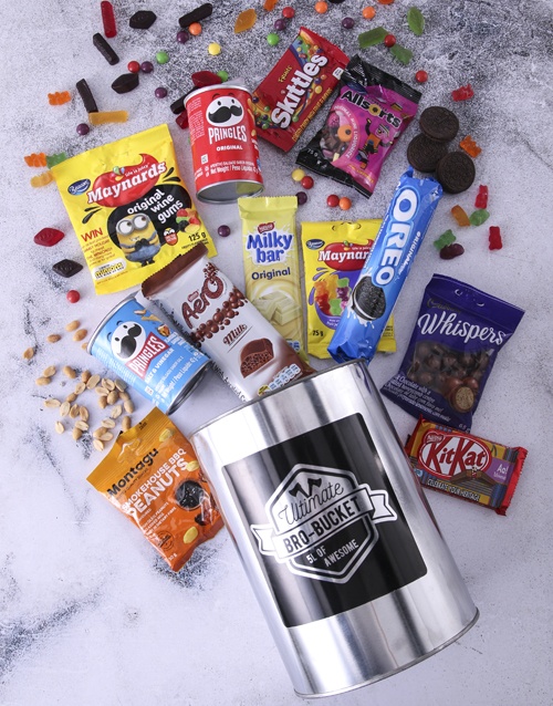 Get them munching with happiness when you gift them this sweet sensations bro bucket. This bro bucket bursts with so much flavoursome treats best suited for the sweet toothed dude in your life. The standard bro bucket comes crammed with Oreo cookies (152g) Nestlé Milkybar (80g) Nestlé Aero (85g) 2x sets of Pringles chips (47g) Cadbury Whispers (65g) Liquorice Allsorts (75g) Rascals sweets (38g) and Beacon wine gums (125g). The medium bro bucket comes with extra Jelly Teddies (75g) Nestlé Kit Kat (45g) and Smokehouse BBQ peanuts (50g). The large has even more goods added like Oreo cookies (38g) roasted chutney corn (100g) and Cadbury Astros (40g).