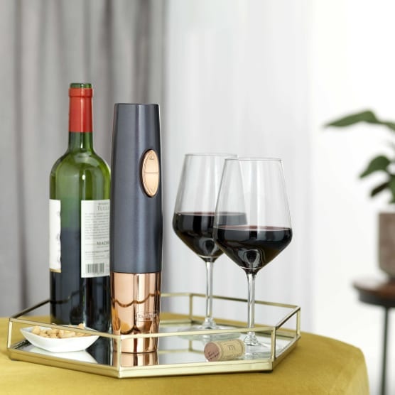 Use the foil cutter which is neatly stored in the charging base to cut perfectly around the top of the wine bottle and open the foil casing