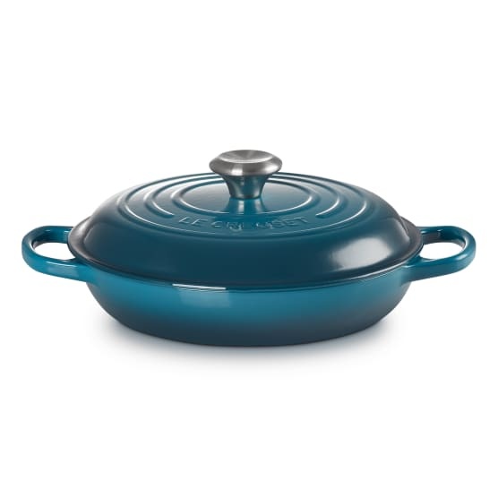 This updated kitchen classic enhances the cooking process by evenly distributing heat and locking in the optimal amount of moisture. With ergonomic handles and advanced interior enamel that resists chipping and cleans easily Le Creuset’s Signature Shallow Casserole blends the best of the past with the latest innovations in comfort and functionality. Most braising recipes call for searing the meats or vegetables at a high temperature then finishing covered on lower heat creating a natural gravy. These family-sized casseroles are perfect for stews with both meats and vegetables. 2L Shallow Enamelled Cast Iron Casserole in Deep Teal.