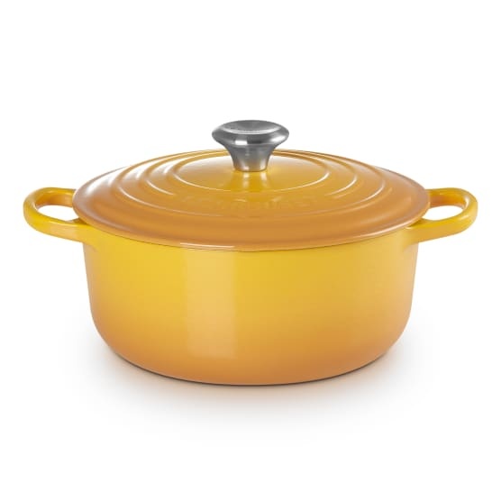 Le Creuset is known the world over for making the best in cast iron cookware with its beautiful bright colours and long-lasting quality. The Signature range has the classic durable and hygienic enamel finish but also includes wider handles that provide even weight distribution and a secure grip and larger more comfortable knobs that are heat resistant up to 260°C. 2.4 litre round cast iron casserole in Nectar.