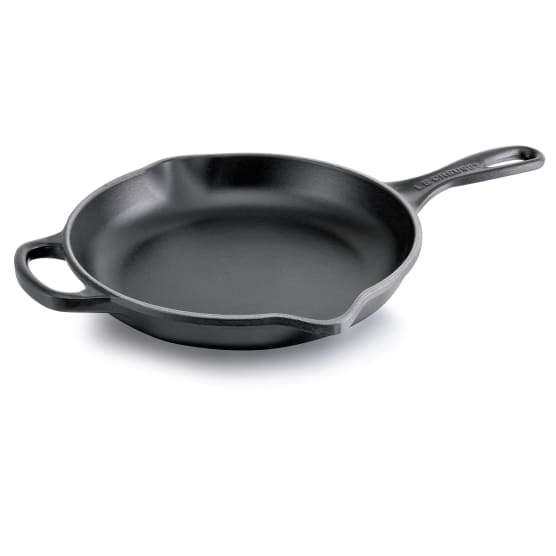 Le Creuset's new Signature skillets feature a helper handle for easier lifting and added control when moving between stovetop oven and table. Cast iron skillets have long been treasured kitchen staples for stovetop frying and oven baking. Over time the matte black interior enamel develops a natural patina that is ideal for searing and frying. Pour spouts on two sides allow for drip-free pouring.