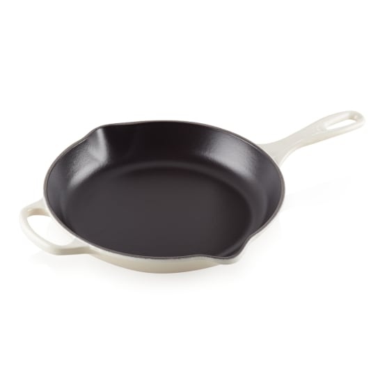 Le Creuset's Signature Round Cast Iron Skillet features a helper handle for easier lifting and added control when moving between stovetop oven and table. Cast iron skillets have long been treasured kitchen staples for stovetop frying and oven baking. Over time the skillet’s black interior enamel develops a natural patina that is ideal for searing and frying.
