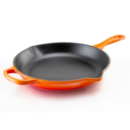 Le Creuset's Signature skillet features a helper handle for easier lifting and added control when moving between stovetop oven and table. Cast iron skillets have long been treasured kitchen staples for stovetop frying and oven baking. Over time the matte black interior enamel develops a natural patina that is ideal for searing and frying. Pour spouts on two sides allow for drip-free pouring.
