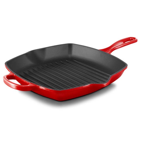 The Le Creuset Signature Square Skillet Grill gives all the delicious flavour of an outdoor grill with all the convenience of indoor cooking. High ridges allow excess fat and grease to drain while spouts on either side allow for drip-free pours. Over time the satin black interior develops a natural patina — ideal for searing and frying. Setting the Signature Grill apart is its loop handle added for extra stability when lifting a full pan.