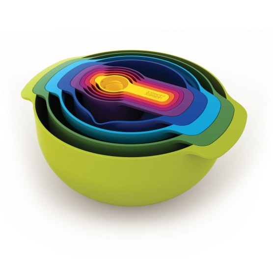 The mixing bowls and colander and sieve have wide handles and the bowls have non-slip feet for easy mixing. The measuring cups snap together and the whole set nests together to minimise the footprint when not in use and the small bowl has measurements integrated into it.