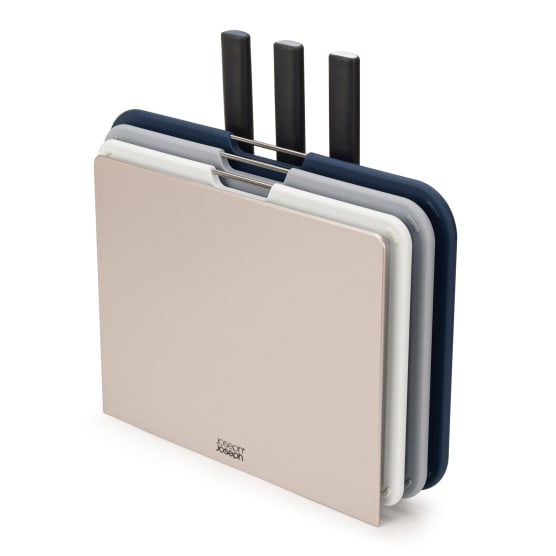This 6 Piece Knives and Nesting Boards Set by Joseph Joseph consists of three essential kitchen knives and three colour-coded chopping boards stored together in a handy storage stand. Space saving and good looking you'll love the clever design and functionality.