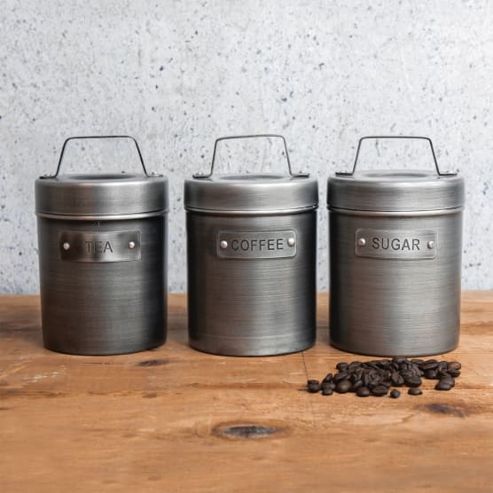 Embrace the elegance of industry in your home with these canisters for tea and coffee and sugar from KitchenCraft's Industrial Kitchen collection.What's in the box:1 Tea Canister1 Coffee Canister1 Sugar CanisterSubject to availability