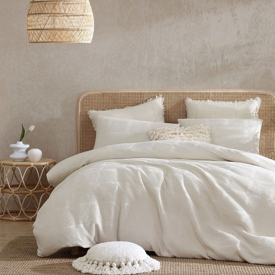The Linen House Vanilla Galicia Duvet Cover Set is a classic 100 percent cotton waffle weave with a twist. The set features a contrast stripe for a subtle check design within its classic waffle weave on the front side with a plain percale weave on the reverse.