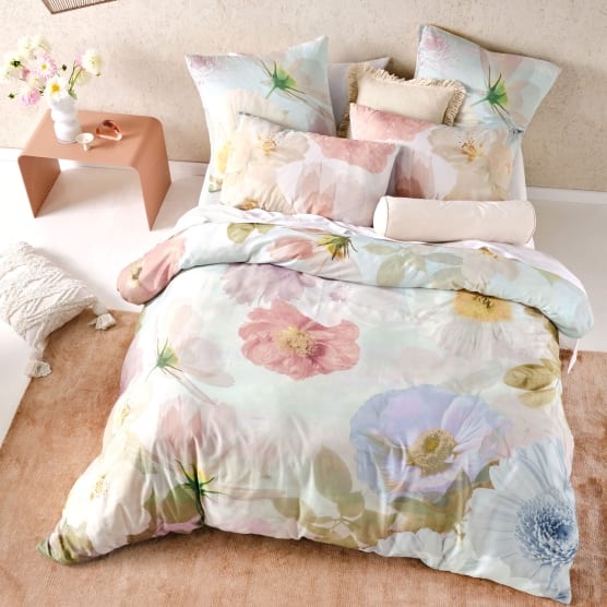 The prettiest ensemble Gaia's alluringly soft romantic hues are accented with delightful illustrations of large-scale blooms. Made from luxe cotton sateen this set will make quite the statement in your bedroom. Cotton duvet cover set with 2 standard pillowcases.Subject to availability ...Read more