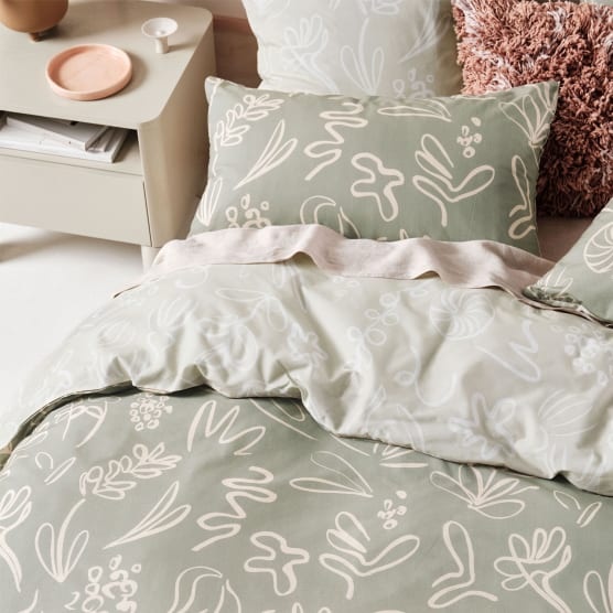 A loosely-inspired and arresting Matisse-come-Australiana design Adley is a fully reversible beauty made from textured cotton. It features an array of abstract Australian-style botanicals dispersed over a stunning pastel eucalyptus green background and is sure to add interest in any bedroom.