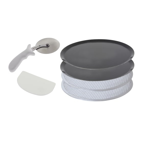 Want to make delicious home-made pizzas? This pizza gift box set includes 2 perforated pizza screens with a diameter of 28cm for thick pizza and 2 round trays made of blue steel with a diameter of 28cm for thin crust pizza. Plus it includes a pizza cutting wheel and a supple dough scraper. It also features tips from Philippe Laruelle Maitre Cuisinier de France to help you perfect your pizza game.