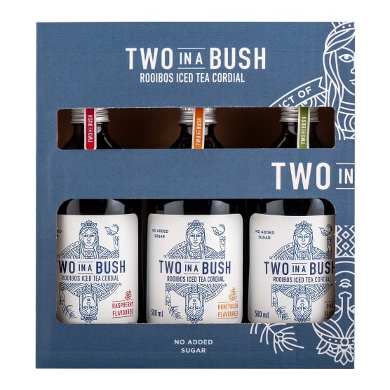 This Giftpack contains three bottles of Rooibos Iced Tea Cordial made with organic Rooibos tea leaves and pure spring water blended with hand-picked botanicals spices and natural fruit to enjoy as a refreshing and delicious soft drink mocktail or cocktail drink. Sweetness is provided by adding a little natural fruit concentrate resulting in a low-sugar healthier option.