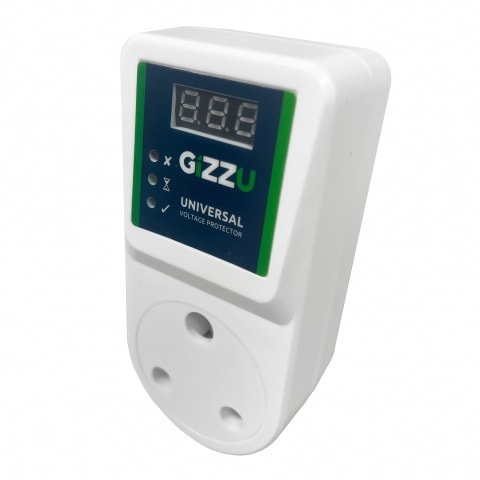 The Gizzu Universal Voltage Protector Plug protects your appliances against damage caused by high voltage low voltage voltage dips and power surges. It monitors the electricity voltage and automatically disconnects the power if the voltage is too high or too low — protecting appliances and electronics from damage. This is an essential accessory for environments with inconsistent power supply and is rated for 16A current. It regulates voltages between 180V and 260V to provide a stable supply to your appliances. If the voltage moves outside of these limits power is cut to protect the equipment. Recommended for fridges freezers coolers washing machines computers TVs and HiFis. Simply connect your appliance to the mains via the Gizzu Universal Voltage Protector Plug to keep it safe.