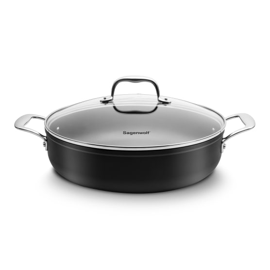 The Sagenwolf Titanium Series Nonstick Chef's Pan can be used on any type of cooking surface including induction. It has a durable nonstick coating on the inside and outside making it ideal for everyday cooking as well as comfortable grip helper handles that secure any movement. These Sagenwolf Chef's Pans are deeper than most frying pans and as versatile as a pot making it simple to prepare a wide range of one-pot meals and more!.