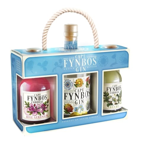 This ultra-refreshing gift pack contains one 500ml bottle of the finest Cape Fynbos Gin and two 200ml cordials — one buchu cordial and one rose geranium cordial made with hand-picked botanicals. Cape Fynbos Gin is distilled from the finest pure spirit infused with more than 30 botanicals mostly indigenous fynbos. The result is a superior gin with deep and complex herbal aromas — hints of orange essence cloves and white pepper honey and wild fynbos.