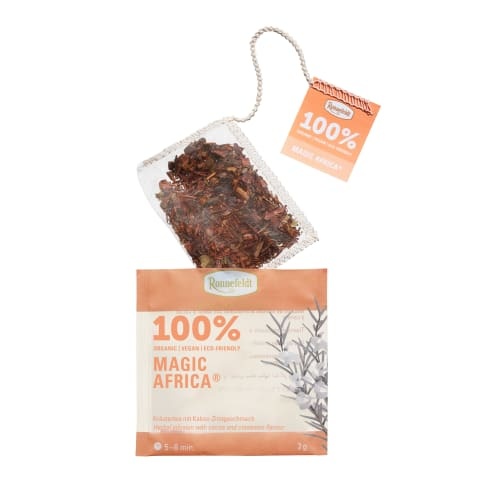 Made from the finest African tea leaves and a blend of handpicked herbs and spices this Magic Africa Tea is a magical journey in every sip. With hints of cocoa and cinnamon this caffeine-free rooibos delivers a soothing escape perfect for unwinding!