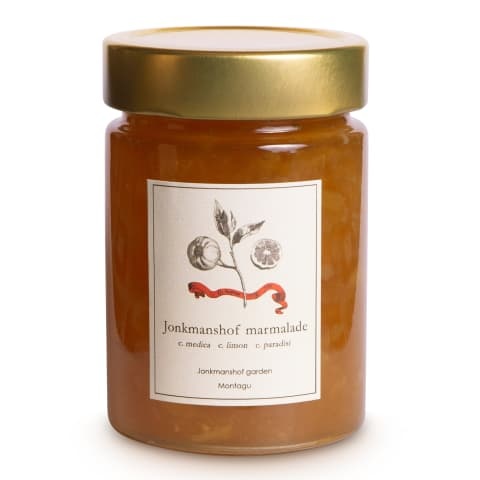 The Jonkmanshof Marmalade is made from home-grown citrus at the Jonkmanshof residence in the Klein Karoo town of Montagu. This unique marmalade blend of several citrus varieties allows for a slightly darker marmalade with a bitter orange taste. Fruit is carefully selected and harvested by hand by owner and chef of both Hemelhuijs and Jonkmanshof Jacques Erasmus. Enjoy with freshly baked homemade bread and butter. Enjoyable with a great selection of cheeses wine and ham products.