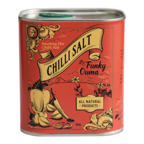 Add a touch of heat to your dish with Funky Ouma Chilli Salt. It's 10 out of 10 in flavour but 6 out of 10 in strength. Easy going and versatile it's great over avocado for a simple quick guacamole or on chicken steak pizza and veggies. Another favourite is sprinkled on eggs at breakfast time or in a bloody Mary cocktail.