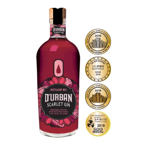 The Durban Scarlet Gin is a world first! This small batch designer gin uses cascara the red flesh that encases a coffee bean to introduce subtle berry undertones making this both a complex and inviting spirit. With notes of juniper citrus and — you can't go wrong. The deep red colour gives it a striking appearance both in the bottle and in a glass making this the perfect addition to your bar cart.