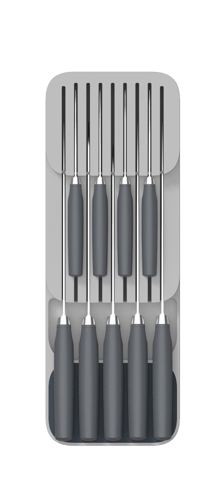 DrawerStore™ Knife Organiser saves space in your cutlery drawer by stacking your knives over two levels keeping them safely and securely in place. The 2-tiers can hold two different blade lengths in a neat compact space. Non-slip feet on the base stop the unit from sliding around in your drawer.