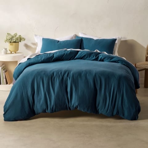 Wrap yourself in nature’s embrace with the Teal Galene Duvet Cover Set. This luxe set features an intense shade of teal constructed from fine cotton yarns creating a soft and inviting texture that captures light beautifully with its rippled surface. With a smart knife-edge finish and two matching standard pillowcases this duvet cover reverses to a plain-dyed fabric for versatile styling. Layer it with colourful scatter cushions and coordinating throws to create a cosy retreat that invites relaxation and restful sleep.