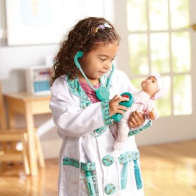 The doctor will see you now! Equip your little doctor with this realistic role-play set complete with five sturdy plastic tools for pretend-play checkups. The machine-washable jacket features see-through pockets for the reusable plastic name tag and tools: reflex hammer thermometer ear scope syringe and stethoscope with sound effects!