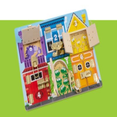 Undo a lock or latch swing open the numbered door and count on finding fun when the picture beneath is revealed on this wooden play board and educational toy! Build fine motor skills while learning colors numbers animals and more!