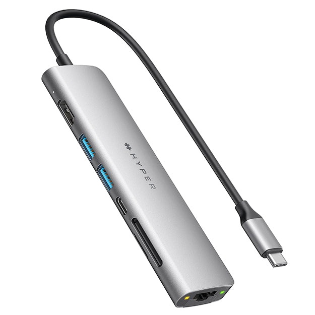 HyperDrive SLAB 7-in-1 USB-C Hub is a sleek slim USB-C hub designed to maximise productivity in a portable package. It features 7 essential ports instantly providing single 4K 60Hz display support 90W power delivery passthrough charging high-speed Gigabit Ethernet as well as SD/MicroSD UHS-I 104MB/s so you can quickly transfer any photos or videos.