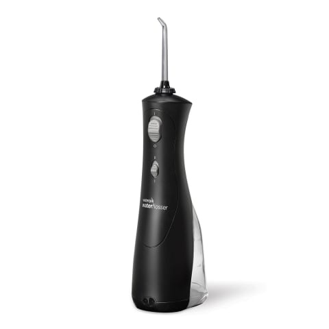 Perfect for travel Waterpik's Cordless Plus Water Flosser features dual-pressure control in-handle for a personalised clean. Choose the classic jet tip for general use or the plaque seeker tip for implants crowns veneers and bridges — reaching even the trickiest spots. The orthodontic tip 3x more effective than floss is a braces game-changer. With an ergonomic design easy-fill reservoir and rechargeable battery it's oral care made easy!
