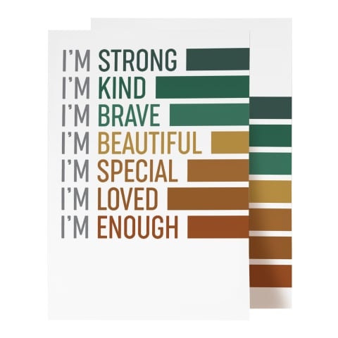 Boost your child’s confidence with these Self-Affirmation prints. Whether it’s morning bath time or bedtime these prints offer a fun visual cue to build this healthy habit. This set includes two prints — one filled with empowering affirmations and another with playful stripes. Mix and match the desi ...Read more