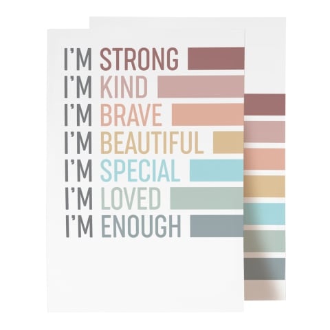 Boost your child’s confidence with these Self-Affirmation prints. Whether it’s morning bath time or bedtime these prints offer a fun visual cue to build this healthy habit. This set includes two prints — one filled with empowering affirmations and another with playful stripes. Mix and match the designs to suit your space — align the frames or have fun with the stripes. Perfect for adding a touch of positivity to any nursery bedroom or playroom.