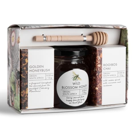 This sophisticated and beautifully packaged Tea and Honey Gift Set is the perfect taste of Africa. A charming combination of honeybush rooibos chai and wild blossom honey makes for a classic pairing that is sure to impress any tea lover. The reusable honey dipper takes this set to a new level and is ideal for sharing with loved ones.