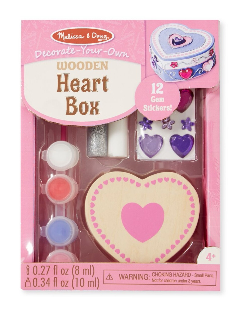Looking for the perfect spot for storing those treasures that are close to your heart? This kit includes sturdy wooden heart-shaped box glitter glue white glue colourful gem stickers 4 pots of paint and a paintbrush. A perfect activity for parties or rainy days.